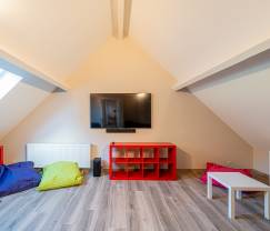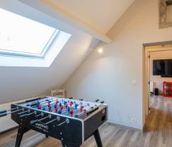 Das Haus verfügt über 5 Schlafzimmer und 5 Badezimmer, ideal für große Familien oder Freundesgruppen. Das geräumige Wohnzimmer ist mit einem Kicker für gemütliche Abende ausgestattet. Das Spielzimmer und der Entspannungsbereich bieten zusätzlichen Platz für Entspannung und Spaß.