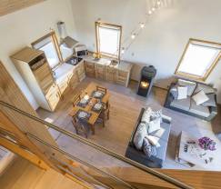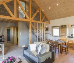Gehen Sie die Treppe hinauf und Sie gelangen in den Wohnbereich, ein großer Raum, der durch das viele Holz warm und einladend wirkt: Eichendielen, Holzküche, holzvertäfelte Decken. Dieser Innenausbau, bei dem an Holz nicht gespart wurde, verleiht dem Ferienhaus einen Touch von "Chalet der Ardennen".