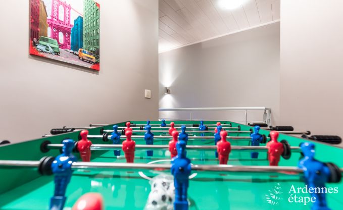 Im Flur des Obergeschosses wurde eine Spielecke mit Mini-Tischkicker, Mini-Billardtisch und Gesellschaftsspielen eingerichtet.