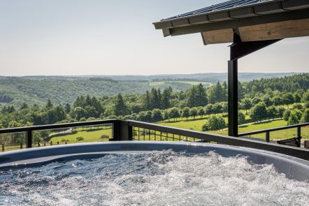 Eines der Highlights dieses Ferienhauses ist das Holz-Whirlpool mit Blasen, in dem Sie sich wunderbar entspannen können, während Sie die herrliche Aussicht auf die umliegenden Landschaften genießen. Die überdachte Terrasse bietet einen Panoramablick auf die Landschaft, perfekt für einen entspannten Abend mit einem Grill. Der Privatgarten ist mit komfortablen Gartenmöbeln ausgestattet und bietet einen idealen Ort für Kinder zum Spielen.