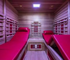 Der Garten lädt zur Entspannung ein. Hier verfügen Sie über eine Terrasse mit Feuerschale, ein Boulodrome und einen Wellnessbereich mit Infrarotsauna (die Hitze ist schonender als bei einer herkömmlichen Sauna) und skandinavischem Badefass.