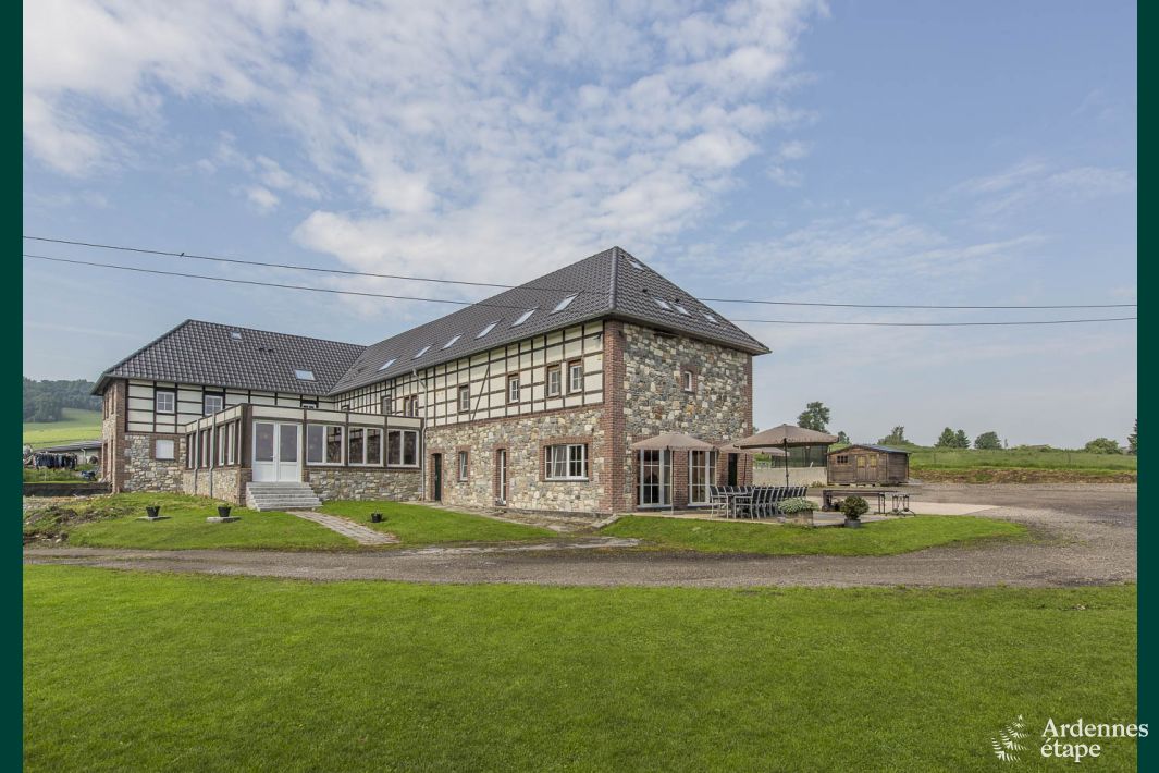 Combinaison de deux maisons pour vous offrir un ensemble spacieux avec de la place pour grands et petits. Ce gîte à la ferme se trouve dans la région des 3 frontières dans un environnement buccolique. Les propriétaires ont restauré ces anciens bâtiments avec beaucoup goût tout en proposant un excellent niveau de confort. Chaque chambre dispose de sa propre salle de bains et une grande véranda vous servira de salle à manger pouvant accueillir jusqu'à 42 personnes. De plus, la région se prête parfaitement à des balades au départ de la maison de vacances. N'attendez donc plus pour réserver ce bien rare...
