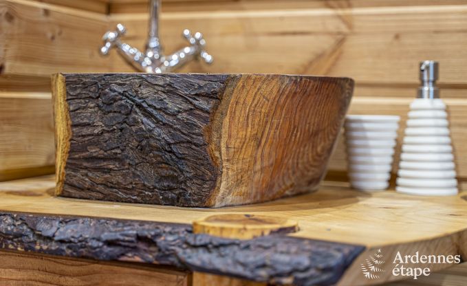 Gönnen Sie sich eine Auszeit zu zweit in diesem hübschen Wohnwagen aus Holz mit 1 Schlafzimmer, 1 Badezimmer und einem skandinavischen Badefass.