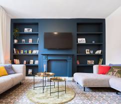 Im Erdgeschoss befinden sich die Wohnräume: ein geräumiges Wohnzimmer in einem stilvollen nachtblauen Farbton mit originalen Vintage-Fliesen. Das große Esszimmer grenzt an die voll ausgestattete Küche, in der man mit Freude kochen und einen Aperitif rund um die wunderschöne Kochinsel genießen kann. Von der Küche aus hat man Zugang zur privaten Terrasse auf der Gartenseite.