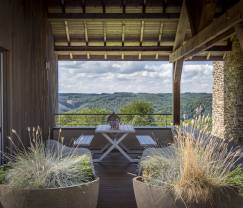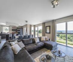 Die Terrasse, der Garten und das Outdoor-Jacuzzi haben Talblick. Das Gleiche gilt für die Gemeinschaftsbereiche: Eine große Fensterfront lässt Licht und Natur herein, so dass hier ein wahres Panorama-Wohnzimmer entsteht. Der Ausblick ist zu jeder Jahreszeit und bei jedem Wetter ein Traum: wenn sich die Wälder herbstlich färben, an einem nebligen Morgen, wenn die ersten Sonnenstrahlen wie im Märchen das Grün erstrahlen lassen, oder auch im Winter, wenn ein weißer Mantel die Landschaft bedeckt. Schon jetzt ist klar: Sobald man einmal hier auf dem Sofa sitzt, will man nicht wieder weg... Wer könnte es einem verübeln?