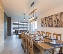 Der große Salon verfügt über ein komfortables Canapé, in dem Sie es sich am warmem Holzofen gemütlich machen können. Der runde Tisch in diesem Raum eignet sich ideal für Gesellschaftsspiele. Die großen Glasfenster des Wohnzimmers bieten eine wunderschöne Aussicht auf den Garten und zugleich Zugang zur Terrasse, die für gesellige Mahlzeiten in der Abendsonne gut eingerichtet ist.