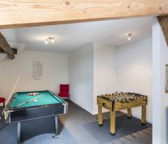 Im Inneren des Ferienhauses findest du ein geräumiges Spielzimmer, das stundenlangen Spaß garantiert. Fordere deine Freunde zu einer Partie auf dem Billiardtisch oder dem Kicker heraus. Der Holzofen sorgt für eine warme und gemütliche Atmosphäre, perfekt für die kälteren Abende. Für die Kleinen sind Kinderspiele vorhanden, damit auch sie sich keine Sekunde langweilen.