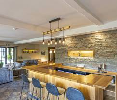 Im Erdgeschoss befindet sich ein schöner Gemeinschaftsbereich mit einer Barecke, die direkt mit dem Wohnzimmer mit offenem Kamin und der Ihnen zur Verfügung stehenden, professionell ausgestatteten Küche kommuniziert. Hier werden Sie angenehme Momente verbringen.