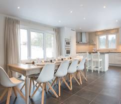 Die Küche ist mit hochmodernen Elektrogeräten ausgestattet und zum Esszimmer hin offen.
