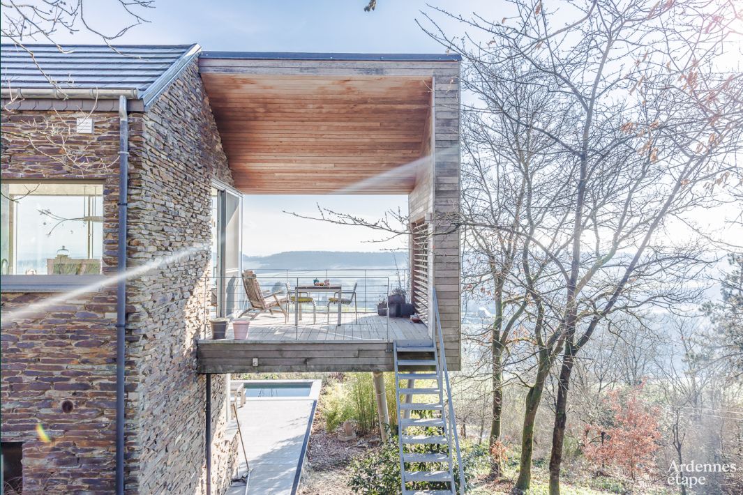 Luxusvilla mit Panoramablick über das Ourthe-Tal. Ein Juwel der zeitgenössischen Architektur – mit viel Lichteinfall, 4 Schlafzimmern und einem großen Garten mit Badeteich. 1 Hund ist erlaubt.