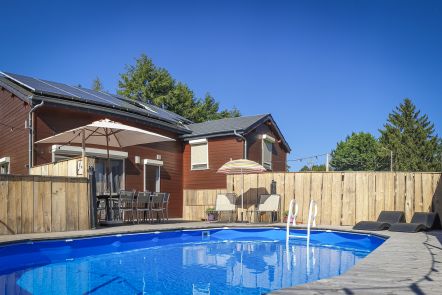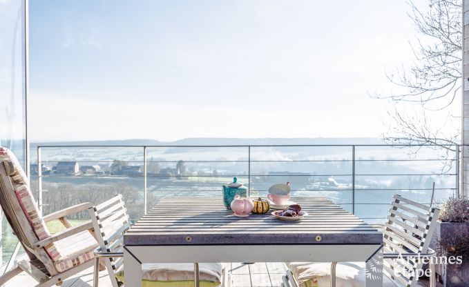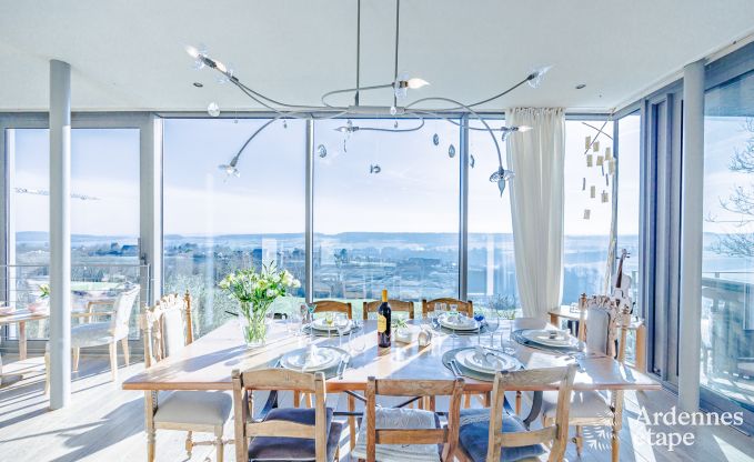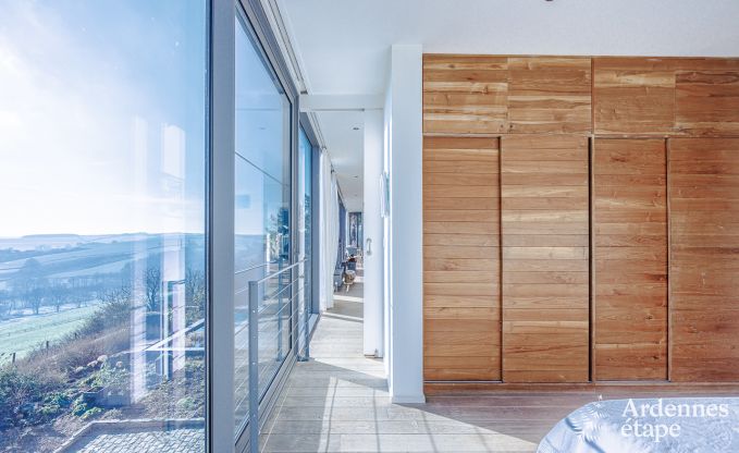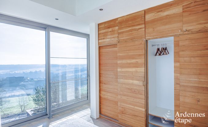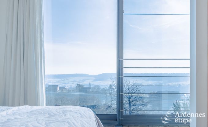 Luxusvilla mit Panoramablick über das Ourthe-Tal. Ein Juwel der zeitgenössischen Architektur – mit viel Lichteinfall, 4 Schlafzimmern und einem großen Garten mit Badeteich. 1 Hund ist erlaubt.