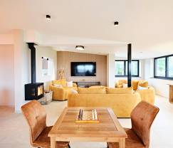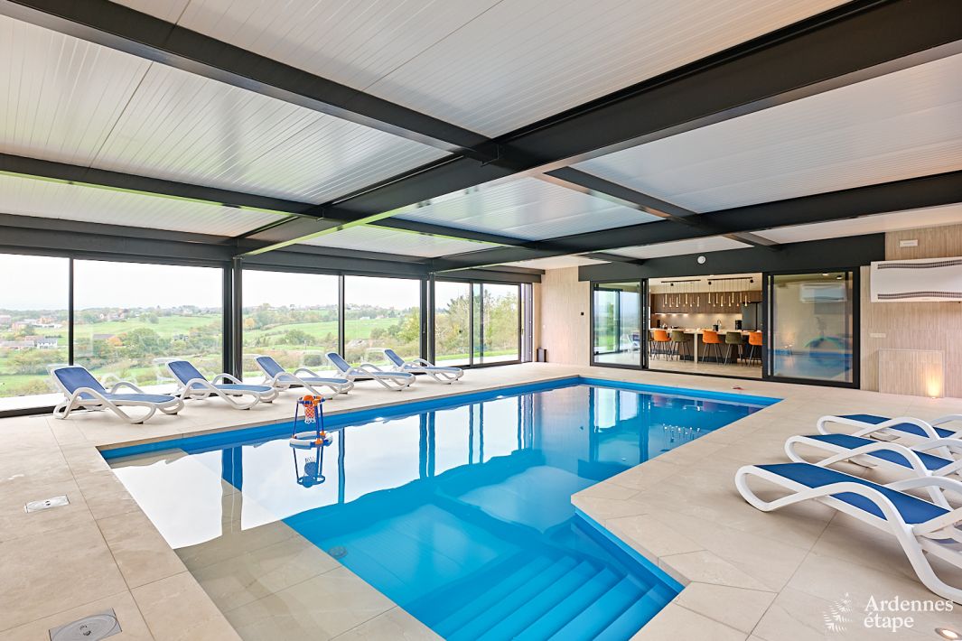 Diese Luxusvilla in Somme-Leuze ist perfekt für Gruppen von 12 Personen, die gemeinsam einen komfortablen und stilvollen Urlaub in den Ardennen genießen möchten. Am Ende einer Sackgasse gelegen, auf den Höhen des charmanten Dorfes Noiseux, bietet diese Villa einen atemberaubenden Panoramablick über die umliegende Landschaft und den Kirchturm des Dorfes. Dank der fast vollständig verglasten Fassaden kann man diese wunderschöne Umgebung von fast jeder Ecke des Hauses bewundern.