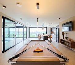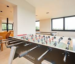 Eine Treppe nach unten führt dich in das Gartengeschoss, wo sich noch einmal 3 Doppelzimmer befinden, jeweils mit eigenem Bad. Hier findest du auch einen Entspannungsraum mit einer Infrarotkabine und einen zweiten Wohnbereich mit einer zweiten voll ausgestatteten Küche und einem Esszimmer. So kann man zu verschiedenen Tageszeiten in unterschiedlichen Atmosphären zusammenkommen. Von diesem Wohnbereich hast du Blick auf das Hallenbad, wo die Kinder spielen können, während die Erwachsenen ein Getränk und eine Partie Billard genießen (oder natürlich auch das Schwimmbad).