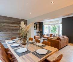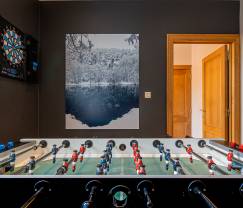 In diesem Urlaubsdomizil genießen Sie nicht nur eine fantastische Lage. Auch das Haus selbst bietet nichts als Superlative. Alle Räume sind äußerst geschmackvoll und behaglich mit stilvollem Mobiliar eingerichtet. Das Wohnzimmer mit seinen gemütlichen Sofas und dem Einbaukamin lädt zu langen abendlichen Plauderrunden im warmen Schein des Kaminfeuers ein. Gleich nebenan in dem offenen Wohnbereich befinden sich das komfortable Esszimmer sowie der Hobbybereich mit Kickertisch und Dartscheibe. In der perfekt ausgestatteten Küche kommen die Hobbyköche unter Ihnen voll und ganz auf ihre Kosten – es ist alles vorhanden, was es für das Ausleben der kulinarischen Künste braucht. In den 4 Schlafzimmern werden alle Gäste eine wunderbare Nachtruhe genießen. Die Kinder werden das Etagenbett lieben, das höchst originell in Form einer Holzhütte maßgefertigt wurde. Das Haus verfügt über 2 Bäder und alles wurde im Hinblick auf maximalen Komfort und optimale Entspannung gestaltet. So gibt es unter der Treppe sogar eine Gaming-Konsole mit echtem Gaming-Stuhl. Game over? Keineswegs, denn Sie sind noch gar nicht draußen gewesen! Auf der fabelhaften Terrasse haben Sie die Qual der Wahl. Möchten Sie zuerst ein paar Runden im Pool drehen? Oder lieber in der Sauna oder im Hot Tub relaxen? Sie können aber auch einfach nur entspannt dem Plätschern des originellen Wasserfallbrunnens lauschen, der von einer beim Ferienhaus entspringenden Quelle gespeist wird und vom Eigentümer – einem Steinmetz – eigenhändig gebaut wurde. Oberhalb der Terrasse führt eine Treppe zum höhergelegenen Garten, der 500 Meter weiter an den Wald grenzt. Eines dürfte inzwischen klar sein: Dieser Ort ist einfach zauberhaft!