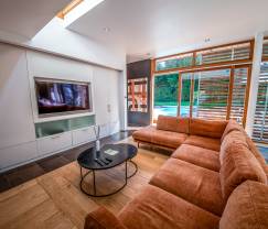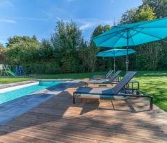 In den 3 liebevoll und individuell eingerichteten Zimmern haben 6 Personen unter besten Bedingungen Platz. Daneben stehen Ihnen 3 Badezimmer zur Verfügung, darunter eines mit Whirpool. Im Erdgeschoss befindet sich der große Wohnbereich. Hier gibt es mehr als eine gemütliche Ecke und das Ambiente wird von einem bemerkenswerten, modernen Wohndekor unterstrichen. Die Sitzecke ist ganz nach Lust und Laune der Ort für besinnliche Abende am Kamin oder für Spass mit der ganzen Familie an der Spielkonsole. Im Essbereich versammeln sich alle zu einem leckeren gemeinsamen Essen, das in der voll ausgestatteten Küche von Meisterhand zubereitet wurde. Auch der Außenbereich ist ausgesprochen gepflegt und die warmen und sonnigen Tage verbringt man gerne am Swimmingpool. Die Terrasse und der Grill in Reichweite machen das Glück komplett.