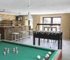 Im Erdgeschoss findet in den verschiedenen, sich aneinander reihenden Räumen jeder sein Glück. Es gibt eine Bar mit Billardtisch, Kickertisch und Dartspiel, eine gemütliche Sitzecke mit Holzofen, eine voll ausgestattete Küche, zwei Terrassen, eine auf der Rück- und eine auf der Vorderseite des Hauses, sowie eine Außenanlage, die für jedes Alter etwas zu bieten hat. Die Kleinsten werden die Spielgeräte auf dem ringsum eingezäunten Garten zu schätzen wissen und die Großen die Sitzecke am offenen Kamin für eine gemütliche Runde.