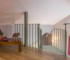 Sobald Sie durch die Tür sind, gelangen Sie in die Küche, die mit der Terrasse kommuniziert. Auf dem Rundgang durch das Haus, wird Sie das Schlafzimmer mit seiner hohen Zimmerdecke und dem originellen Kopfende des Bettes bezaubern. Die Treppe im Schlafzimmer führt Sie in eine Sitzecke, die zu einem guten Buch einlädt.