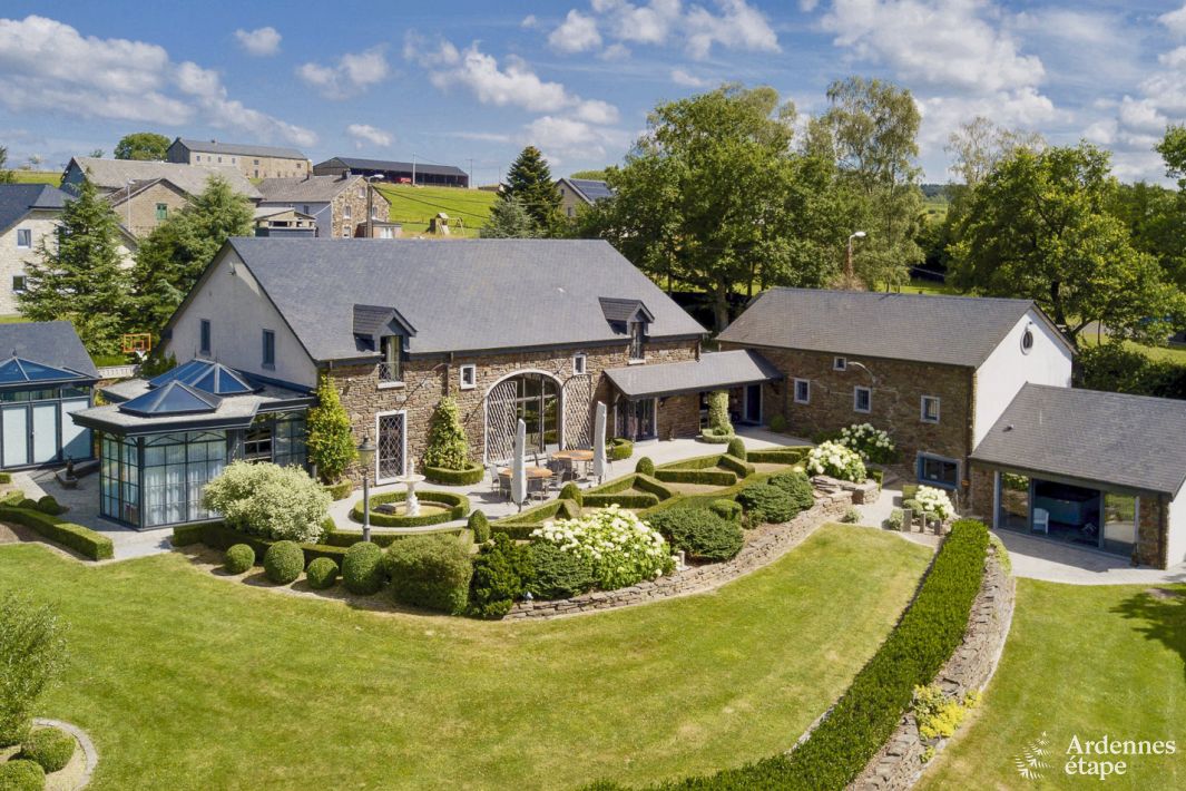 Diese Luxusvilla befindet sich in einem ruhigen Dörfchen, nur 5 km von Stavelot entfernt, im Herzen der belgischen Ardennen. Es gibt fünf Zimmer und sechs Badezimmer, wobei fünf Badezimmer zur privaten Nutzung zu den Zimmern gehören. Die dreigeschossige Villa bietet eine Wohnfläche von insgesamt 700 m². Es gibt Platz für 10-14 Personen. Im Untergeschoss befinden sich der Wellnessbereich, im Erdgeschoss die Gemeinschaftsbereiche und im Obergeschoss die Zimmer. Die großen Fensterfronten und Mezzanine tragen zu dem Eindruck von viel Licht und Raum bei. Der Wohnkomfort ist einfach einzigartig und deshalb hat die Villa 4,5 Sterne. Jeder Raum ist reich mit modernen und alten Objekten dekoriert. Der Wellnessbereich umfasst ein Jacuzzi und eine Infrarotkabine, sowie Trainingsgeräte für Fitness und Muskelaufbau. Die zwei Freizeitsäle mit Spielen sorgen dafür, dass bei den Kindern keine Langeweile aufkommt. Der 2800 m² große Garten ist von Hecken und Zäunen umgeben. Zudem gibt es hier insbesondere eine Schaukel, eine Rutsche, ein Trampolin und eine Boulebahn. In der Mitte des Gartens gibt es zudem ein weiteres, unabhängiges Wohnzimmer für entspannte Momente unter sich.