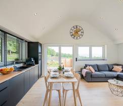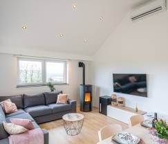 Leicht zu erreichen und doch wunderbar abgeschieden: Bei diesem Ferienhaus beginnt das Urlaubsgefühl bereits vor der Ankunft! Ihr Ferienhaus eignet sich hervorragend für einen Aufenthalt mit 4 Personen. Im behaglichen Wohnzimmer können Sie es sich beim Holzpelletofen gemütlich machen. In dem offen gestalteten Wohnbereich, der ein großzügiges Raumgefühl vermittelt, befinden sich auch die komplett ausgestattete Küche und der Essbereich. Unter- und Obergeschoss profitieren von viel Tageslichteinfall. In den 2 Schlafzimmern, die jeweils mit 2 Einzelbetten ausgestattet sind, werden Sie eine erholsame Nachtruhe genießen, denn das Einzige, was dort zu hören ist, sind die beruhigenden Geräusche des Waldes. Auf der Terrasse gibt es einen Grill, der zu wunderbaren Grillabenden mit fabelhafter Aussicht auf den großen Garten und die umliegende Natur einlädt. Die Kinder können sich auf der Rutsche und im Spielhäuschen vergnügen. Sie verfügen über einen abschließbaren Fahrradunterstand und einen Parkplatz mit Ladesäule und Platz für 3 Autos.