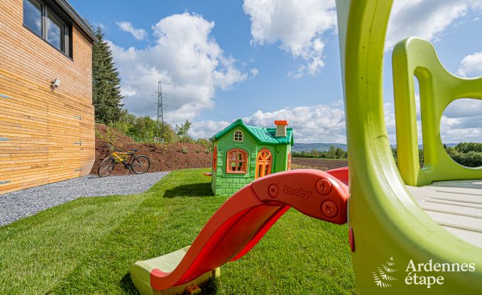 Leicht zu erreichen und doch wunderbar abgeschieden: Bei diesem Ferienhaus beginnt das Urlaubsgefühl bereits vor der Ankunft! Ihr Ferienhaus eignet sich hervorragend für einen Aufenthalt mit 4 Personen. Im behaglichen Wohnzimmer können Sie es sich beim Holzpelletofen gemütlich machen. In dem offen gestalteten Wohnbereich, der ein großzügiges Raumgefühl vermittelt, befinden sich auch die komplett ausgestattete Küche und der Essbereich. Unter- und Obergeschoss profitieren von viel Tageslichteinfall. In den 2 Schlafzimmern, die jeweils mit 2 Einzelbetten ausgestattet sind, werden Sie eine erholsame Nachtruhe genießen, denn das Einzige, was dort zu hören ist, sind die beruhigenden Geräusche des Waldes. Auf der Terrasse gibt es einen Grill, der zu wunderbaren Grillabenden mit fabelhafter Aussicht auf den großen Garten und die umliegende Natur einlädt. Die Kinder können sich auf der Rutsche und im Spielhäuschen vergnügen. Sie verfügen über einen abschließbaren Fahrradunterstand und einen Parkplatz mit Ladesäule und Platz für 3 Autos.