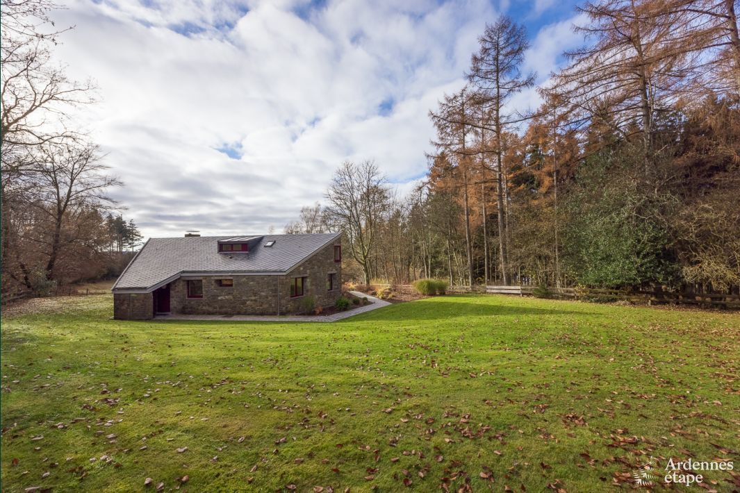 Wenn Sie Ruhe und Natur mögen, sind Sie hier goldrichtig! Dieses schöne freistehende Ferienhaus liegt eingebettet in einer unglaublichen natürlichen Umgebung auf den Anhöhen von Stoumont. Hier wohnen Sie am Rande des Waldes, mitten auf einer Wiese. Das Haus wurde Ende der 60er Jahre von einem bekannten Architekten aus Lüttich entworfen und zeichnet sich durch seine besondere geometrische Form aus: ein Sechseck. Es wurde mit natürlichen Materialien errichtet, wie z. B. Sandstein und Arkosebruchstein, ein Dach aus „Cherbins“ (deutsch: Scherben, Naturschiefer) und Holz. Ein authentischer und origineller Ort , der außerdem über einen großen Rasen und eine Südterrasse verfügt, wo man den Aperitif in der Sonne genießen kann (nicht zu vergessen die zweite Terrasse, die mit einem Grill ausgestattet ist!). Im Inneren werden Sie von dem offenen (Einbau-)Kamin begeistert sein, der die heimelige Atmosphäre unterstreicht, sowie von den großen Fenster, die ideal sind, um die Natur (und gelegentlich auch das Wild) zu bewundern. Überkommt Sie bereits dieses Gefühl des völligen Abschaltens?
