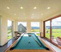 Dieses Ferienhaus in einem kleinen Dörfchen besticht mit weitläufigen Räumen, hochwertigen Baustoffen und raffiniert und geschmackvoll eingerichteten Zimmern. Die Ferienvilla mit acht Zimmern auf zwei Etagen hat Platz für bis zu 18 Personen. Sie befindet sich Stoumont und bietet einen herrlichen Panoramablick auf die umgebende Landschaft. Hier können Sie in Ihrem Urlaub in den belgischen Ardennen einen Wellnessbereich mit Sauna und Sonnenbank nutzen, der im Obergeschoss der Villa eingerichtet wurde. Sollte ein Paar sich etwas absondern möchten ohne auf die gemeinsamen Momente mit der Gruppe zu verzichten, steht gegenüber vom Haupthaus ein Appartment mit Wohnzimmer, Badezimmer und Fernseher zur Verfügung, dass die gewünschte Privatsphäre garantiert. Grill, Outdoor-Swimmingpool und ein 8000 m² großer, offener Garten mit Schaukel und Tischtennisplatte erwarten Sie an sonnigen Tagen.