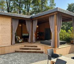 Prachtige terras met houten schutting over de Jacuzzi. Jacuzzi zeer goed onderhouden. Leuke buitendouche. Dit was voor ons een echte meerwaarde.