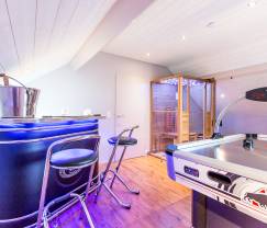 Zum Relaxen wurde ein spezieller Raum eingerichtet. Genießen Sie Entspannung in der Infrarotkabine, schauen Sie sich gemütlich einen Film an oder spielen Sie eine Partie Air Hockey oder Flipper. Im Außenbereich wartet mit dem Outdoor-Jacuzzi mit TV-Bildschirm ein absolutes Luxus-Highlight auf Sie. Das Jacuzzi-Bad steht in einem gesonderten überdachten Anbau. Perfekt, wenn das Wetter einmal nicht mitspielt und Sie dennoch ein entspanntes Urlaubsgefühl genießen möchten. Auch der Garten sieht sehr gepflegt aus und bietet unter anderem eine sonnige Terrasse, Grill, einige Liegen und einen Petanqueplatz. Ein idealer Ort für Entspannung und kurzweilige Unterhaltung!