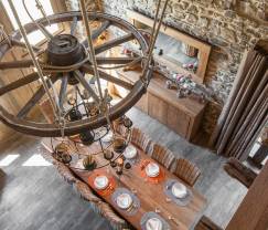 Im Zentrum des Gemeinschaftsbereichs steht der große Kamin mit Sitzgruppe am Holzfeuer, der Essbereich gegenüber dem Stalltor und die voll ausgestattete Küche. Auf dem Mezzanin gibt es eine zweite Sitzgruppe mit Fernseher.