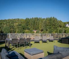 Für Familien mit kleinen Kindern ist an ein Babybett und einen Hochstuhl gedacht, damit auch die Kleinsten komfortabel wohnen können. Die private Terrasse lädt zu langen Sommerabenden ein, Jacuzzi für ein Wellness-Erlebnis mitten in der Natur sorgen. Diese Suite verbindet Komfort mit authentischem Ardennen-Flair, wodurch Ihr Aufenthalt unvergesslich wird.