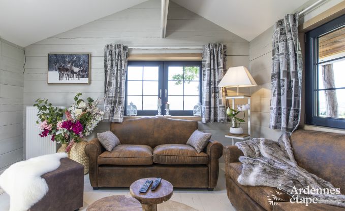 Originell, charmant und alles andere als gewöhnlich: Dieses Ferienhaus ist etwas ganz Besonderes. Schick und gemütlich zugleich, ist es eine echte Wohlfühloase, in der Sie zur Ruhe kommen und alle Sorgen vergessen. Eine Mischung aus Chalet und Hütte in herrlicher Lage mitten in der Natur. Die Inneneinrichtung sorgt für kuschelige Behaglichkeit, während Sie draußen einen traumhaften Blick auf die Landschaft genießen! Für Entspannungsmöglichkeiten ist reichlich gesorgt. Sie verfügen über eine finnische Kota (eine Hütte, die zum Grillen, aber auch als holzbeheizte Sauna oder als Unterschlupf dienen kann – ganz nach Belieben). Außerdem gibt es einen kleinen beheizten und überdachten Pool, den Sie ganzjährig nutzen können, sowie einen Bouleplatz und eine Schaukel im Garten.