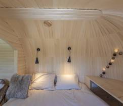 Bereits ein Blick genügt, um dem Charme dieser Holzhütte im nordischen Stil zu erliegen. Mit ihren runden Formen umhüllt sie Sie sanft wie ein Kokon.