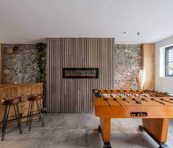 Das Ferienhaus bietet eine breite Palette an Einrichtungen, die Ihren Aufenthalt unvergesslich machen. So gibt es eine gemütliche Bar, an der Sie gemeinsam ein Getränk genießen können, ein Tischfußballspiel für etwas lustigen Wettbewerb und einen großzügigen Spielraum mit verschiedenen Gesellschaftsspielen, um die Abende zu verbringen. Draußen können Sie die private Terrasse mit komfortablen Gartenmöbeln genießen, ideal zum Entspannen oder um eine köstliche Mahlzeit auf dem Grill zuzubereiten.