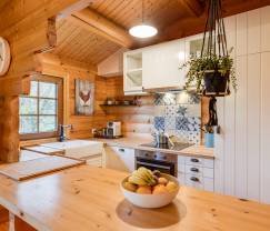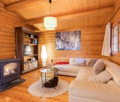 Knus, houten chalet van alle gemakken voorzien. Alles ziet er netjes uit en geeft een gezellige en warme sfeer. Schitterend uitzicht. Vriendelijke eigenaar, we konden op de eerste dag wat eerder en op de laatste dag wat later uitchecken. Voor de slaapkamer met eigen badkamer moet je een trapje van ca. 5 treden af. Het bed daar heeft een behoorlijk hard matras. Wij hebben veel aan de eettafel gezeten, daaraan hadden wel wat meer comfortabele stoelen mogen staan ipv deze stoelen en houten bank.