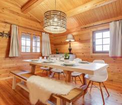 Das eingeschossig errichtete Chalet umfasst 3 Bereiche. Der einladende Wohnbereich bringt den besonderen Reiz der Holzvertäfelungen zur Geltung und bietet Ihnen ein angenehmes Wohnzimmer mit Kaminofen. Der Nachtbereich umfasst 4 Schlafzimmer und 2 Badezimmer: 2 Schlafzimmer für jeweils 2 Personen (davon eins mit Etagenbett und das andere mit Doppelbett und privatem Badezimmer) und 1 Schlafzimmer für eine Person. Für Ihre Entspannung sorgt der Wellnessbereich mit Sauna für 4 Personen.