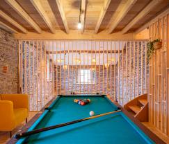 Das Haus ist mit einem Holzofen ausgestattet, ideal für gemütliche Abende am Feuer. Die Kinder werden den Spielraum lieben, der mit allerlei Spielen ausgestattet ist. Und für die Erwachsenen gibt es einen Billardtisch für etwas freundschaftlichen Wettbewerb. Die voll ausgestattete Küche erleichtert die Zubereitung von Mahlzeiten und das Genießen eines gemütlichen Abends zu Hause. Draußen finden Sie einen Grill, perfekt für sommerliche Grillabende auf der Terrasse.