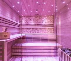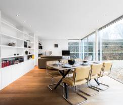 Der Eingang befindet sich auf der Straßenseite im Untergeschoss, das außerdem ein Schlafzimmer, eine separate Toilette und einen Wellnessbereich mit einer geräumigen Sauna beherbergt.