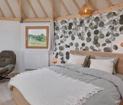 Innen findest du ein gemütliches Schlafzimmer und ein modernes Badezimmer, ideal für einen komfortablen Aufenthalt. Das Bett ist bei Ankunft bereits bezogen, sodass du dich sofort ohne Sorgen entspannen kannst. Für die Allerkleinsten gibt es ein Babybett und einen Hochstuhl. Die Einrichtung strahlt eine warme und heimische Atmosphäre aus, vergleichbar mit einem Hotelaufenthalt, aber mit dem Charme eines Naturhauses.