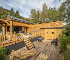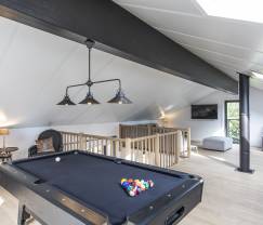 Dieses gemütliche Chalet wurde geschmackvoll und mit viel Liebe zum Detail renoviert, damit Sie hier einen 4-Sterne-Urlaub verbringen können. Über die Treppe gelangen Sie hinunter in der schöne offene Küche, wo Sie leckere Gerichte zubereiten und ausgedehnte Abendmenüs am knisternden Kaminofen genießen können. Sie können natürlich auch im Obergeschoss bleiben und sich im gemütlichen Wohnbereich entspannen oder eine Partie Billard spielen. Auch draußen wurde alles mit viel Liebe zum Detail gestaltet. Wenn Sie auf der (teilweise überdachten) Terrasse stehen, haben Sie das Gefühl, mitten im Wald zu sein. Der Wellnessbereich bietet Ihnen mit seinen großen Fenstertüren zur Terrasse hin ebenfalls einen malerischen Ausblick, der seinesgleichen sucht. So können Sie sich in einem Whirlpool „with a view“ entspannen: Lehnen Sie sich zurück und genießen Sie!