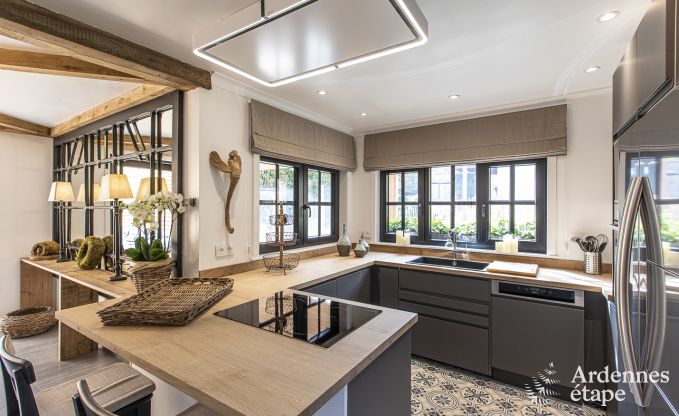 Dieses gemütliche Chalet wurde geschmackvoll und mit viel Liebe zum Detail renoviert, damit Sie hier einen 4-Sterne-Urlaub verbringen können. Über die Treppe gelangen Sie hinunter in der schöne offene Küche, wo Sie leckere Gerichte zubereiten und ausgedehnte Abendmenüs am knisternden Kaminofen genießen können. Sie können natürlich auch im Obergeschoss bleiben und sich im gemütlichen Wohnbereich entspannen oder eine Partie Billard spielen. Auch draußen wurde alles mit viel Liebe zum Detail gestaltet. Wenn Sie auf der (teilweise überdachten) Terrasse stehen, haben Sie das Gefühl, mitten im Wald zu sein. Der Wellnessbereich bietet Ihnen mit seinen großen Fenstertüren zur Terrasse hin ebenfalls einen malerischen Ausblick, der seinesgleichen sucht. So können Sie sich in einem Whirlpool „with a view“ entspannen: Lehnen Sie sich zurück und genießen Sie!