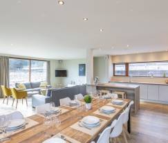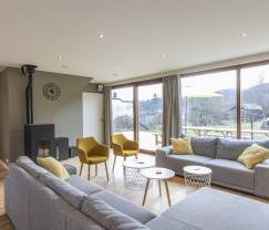 Das Wohnzimmer ist gemütlich eingerichtet mit einem Pelletofen, ideal für die kälteren Abende. Die Küche ist modern und voll ausgestattet, so dass Sie köstliche Mahlzeiten zubereiten können.