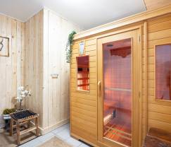 Aber es gibt noch mehr! Diese Unterkunft verfügt über eine Infrarotkabine, in der Sie sich nach einem Tag voller Abenteuer herrlich entspannen können. Und für die Spielvögel gibt es eine Dartscheibe und ein Tischfußballspiel. Draußen finden Sie einen privaten Garten mit einem Grill und einer privaten Terrasse, perfekt für sommerliche Abende.