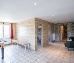 Von der schönen ländlichen Umgebung werden Sie sofort begeistert sein. Freuen Sie sich auf einen ruhigen Urlaub mit der ganzen Familie, bei dem für Erholung, Spaß und Zeitvertreib bestens gesorgt ist. Die Kinder können im großen, teilweise eingezäunten Garten sowie im Hobbyraum mit Kickertisch nach Herzenslust spielen. Für die Erwachsenen gibt es einen Wellnessbereich mit Infrarot-Kabine, in dem es sich nach einer ausgiebigen Wanderung wunderbar entspannen lässt. Zum gemütlichen Beisammensein in großer Runde stehen Ihnen zwei Terrassen (eine davon überdacht) mit Gartenmöbeln zur Verfügung. Nutzen Sie die Plancha für tolle Grillabende im Sommer! Der Bouleplatz wird dabei bestimmt ebenfalls zum Einsatz kommen. Für die Winterabende gibt es in der voll ausgestatteten Küche ein Raclette-Gerät und eine Steingrillplatte. Sie merken schon: Hier findet sich immer eine Gelegenheit für schöne gemeinsame Momente. Dafür sorgt auch die hübsche Einrichtung, die eine besonders gesellige und behagliche Atmosphäre schafft. Der praktische und funktionale Aspekt wurde ebenfalls berücksichtigt. So verfügt das Haus über 4 komfortable Schlafzimmer und 4 moderne Badezimmer.