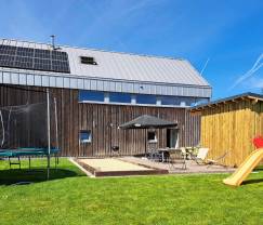 Von der Terrasse, die sich auf gleicher Ebene wie der Wohnbereich befindet, haben Sie einen weiten Ausblick auf die Region und den privaten Garten, wo Sie eine zweite Terrasse mit Liegestühlen für sonnige Tage erwartet. Ihre Kinder vergnügen sich auf der Rutsche und dem Trampolin, während Sie sich um den Holzfeuergrill kümmern.