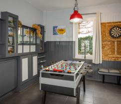 Lust auf einen Aufenthalt mit vielen schönen Fahrradtouren? Dieses Ferienhaus (ein ehemaliges Hotel!) ist erstklassig gelegen in einer malerischen Region mit vielen Höhenunterschieden. Auch in Sachen Fahrräder wurde nichts dem Zufall überlassen: Eine Garage wurde speziell für die Drahtesel eingerichtet, mit Umkleide und Waschküche. Entspannen Sie sich nach einem anstrengenden Tag in der Sauna oder in der Infrarotkabine. Oder nehmen Sie einen Aperitif rund um den Billardtisch bzw. auf der Terrasse im großen Garten. Das Wetter ist herrlich? Um in Urlaubsstimmung zu kommen, gibt doch nichts Besseres als ein leckeres Barbecue! Im Herbst dann eben mit einem dicken Pullover! Die Temperaturen sind im Keller? Holen Sie das Raclette-Gerät heraus! Gemütlich, wärmend und sooo lecker! Keine Lust, früh ins Bett zu gehen? Treten Sie bei einem Kickern oder Dart-Turnier gegeneinander an!