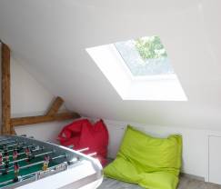 Das geräumige Esszimmer befindet sich direkt unter dem Salon auf der Zwischenebene, wo Sie auch den Kickertisch finden. Die moderne, holzverkleidete Küche ist mit allen Annehmlichkeiten ausgestattet, wie einem 5-Flammen-Keramikkochfeld, Backofen, Mikrowelle, Kühlschrank, Gefrierschrank und Geschirrspüler. Im gemütlichen Wohnzimmer mit Kabelfernsehen, DVD-Anschluss und Hi-Fi-Anlage können Sie es sich richtig gemütlich machen.