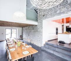 Die Küche ist der zentrale Raum des Hauses. Sie befindet sich zwischen dem großen Wohnzimmer mit Holzofen und Blick auf Terrasse und Garten auf der linken Seite und dem Speisesaal auf der rechten, der ebenfalls auf die Terrasse, den Garten und den Swimmingpool blickt.
