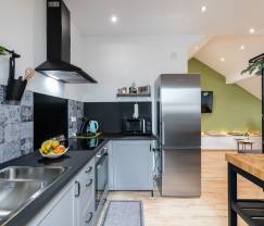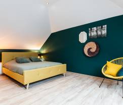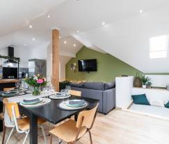 Diese Ferienwohnung unter dem Dach hat eine peppigen, modernen und farbenfrohen Look . Die Unterkunft strahlt unglaublich viel Energie aus. Der offene Wohnbereich ist geschickt in mehrere Bereiche unterteilt, so dass eine gemütliche Lese- oder Spielecke neben der Fernsehecke, aber dennoch getrennt davon, entsteht. Die Schlafzimmer und das Duschbad sind mit allen Annehmlichkeiten ausgestattet. Auf der erhöhten Terrasse können Sie die frische Luft und den Blick auf die Umgebung genießen. Und Sie verfügen sogar über einen kleinen Garten mit Bäumen und Liegestühlen.