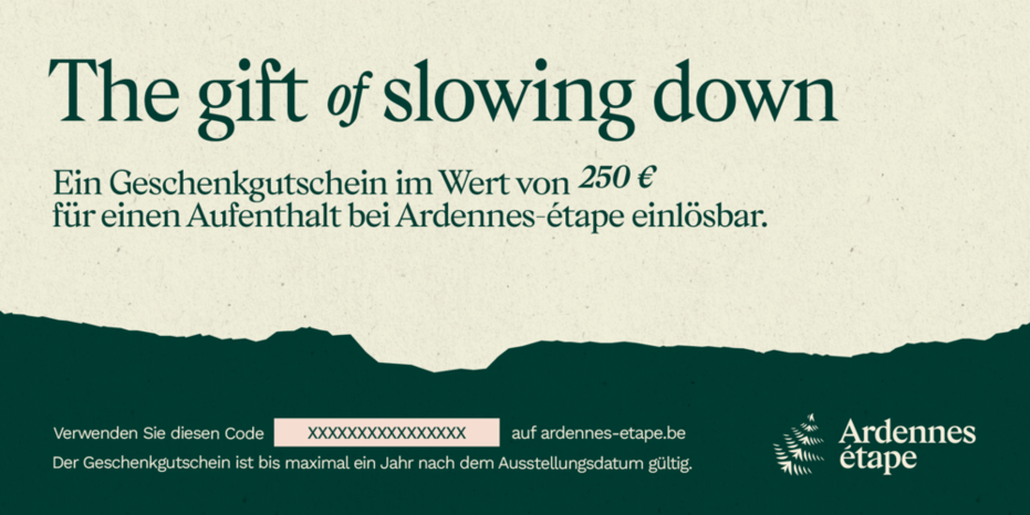 Wählen Sie hier Ihren Ardennes-étape Geschenkgutschein. Ein besonderes Geschenk, womit der Empfänger selbst einen Aufenthalt in einer Ferienwohnung auswählen kann.